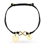 Delikatna bransoletka na czarnym sznurku, ozdobiona złotymi elementami wykonanymi ze złota próby 585. Centralnym motywem jest symbol nieskończoności, uzupełniony subtelnymi zawieszkami w kształcie serca oraz stópek, które nadają biżuterii osobistego i emocjonalnego charakteru. Regulowane wiązanie pozwala idealnie dopasować bransoletkę do nadgarstka, zapewniając komfort noszenia na co dzień. Połączenie czarnego sznurka ze złotymi detalami tworzy ponadczasową, elegancką kompozycję, która pasuje do każdej stylizacji. To wyjątkowy symbol miłości, bliskości i więzi – idealny jako prezent dla bliskiej osoby lub jako subtelny akcent o osobistym znaczeniu.