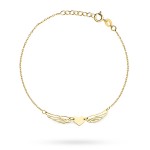 Delikatna złota bransoletka wykonana z wysokiej jakości złota próby 585. Subtelny łańcuszek został ozdobiony centralnym motywem serca z rozłożonymi skrzydłami, symbolizującymi miłość, wolność i opiekę. Polerowane wykończenie nadaje biżuterii elegancki połysk i podkreśla precyzję wykonania detalu. Regulowane zapięcie pozwala na wygodne dopasowanie do nadgarstka, zapewniając komfort noszenia na co dzień. To ponadczasowa bransoletka o wyjątkowej symbolice, idealna jako prezent dla bliskiej osoby lub jako subtelny akcent podkreślający osobisty styl.