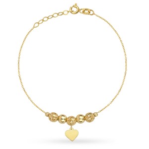 Bransoletka wykonana jest z wysokiej jakości złota o próbie 585, co gwarantuje zarówno elegancki wygląd, jak i odpowiednią trwałość, co sprawia, że biżuteria ta jest nie tylko piękna, ale i wytrzymała. Bransoletka charakteryzuje się delikatnym i eleganckim wyglądem. Na uwagę zasługuje jej finezyjne wykończenie oraz kilka kluczowych elementów ozdobnych. W centralnej części bransoletki znajduje się zestaw kilku złotych kulek, które różnią się między sobą wykończeniem. Kulki o ażurowym wzorze przeplatają się z gładkimi, lśniącymi kulkami, co dodaje bransoletce wyjątkowego uroku i efektu przestrzenności. Ażurowe kulki nadają całości lekkości i artystycznego charakteru. Poniżej centralnych kulek znajduje się delikatna zawieszka w kształcie serca. Jest ona również wykonana ze złota i pełni rolę subtelnego akcentu, który dodaje bransoletce romantycznego charakteru. Serce symbolizuje miłość i uczucia, co sprawia, że bransoletka może być doskonałym prezentem dla ukochanej osoby. Bransoletka posiada cienki, delikatny łańcuszek, który dopełnia całości i sprawia, że ozdoby centralne są w centrum uwagi. Łańcuszek jest subtelny, co zapewnia elegancki wygląd bez zbędnego przepychu. Bransoletka wyposażona jest w solidne i bezpieczne zapięcie typu karabińczyk, które gwarantuje, że pozostanie na swoim miejscu podczas noszenia. Dodatkowo, posiada łańcuszek przedłużający, umożliwiający regulację długości, co zapewnia komfort noszenia i dopasowanie do różnych rozmiarów nadgarstka.Ta złota bransoletka o próbie 585 to doskonały wybór dla osób ceniących klasykę z nutą nowoczesności, a także idealny prezent, który podkreśli wyjątkowy charakter każdej kobiety.