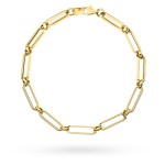 Bransoletka wykonana ze złota próby 585 o nowoczesnym splocie z długich, prostokątnych ogniw to wyjątkowy przykład minimalistycznej elegancji. Jej geometryczna forma przyciąga wzrok subtelnym blaskiem i doskonałym wykonaniem. Bransoletka jest lekka, stylowa i efektowna, idealna zarówno do codziennych stylizacji, jak i na specjalne okazje. To ponadczasowy dodatek, który podkreśla indywidualny charakter i wyczucie stylu noszącej ją osoby.