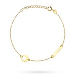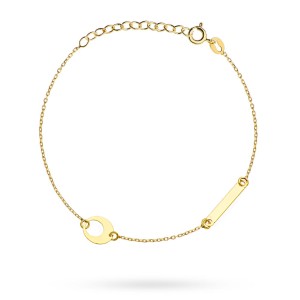 Bransoletka wykonana ze złota próby 585 urzeka nowoczesnym i minimalistycznym designem. Delikatny łańcuszek zdobi motyw kółka w kole – symbol jedności i harmonii – oraz gładka złota blaszka, idealna do personalizacji, np. poprzez grawer z imieniem, datą lub inicjałami. Subtelny blask złota i precyzyjne wykonanie nadają biżuterii elegancki, a zarazem współczesny charakter. To stylowa i symboliczna bransoletka, doskonała na prezent lub jako codzienny akcent podkreślający indywidualność.