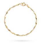 Bransoletka wykonana ze złota próby 585 to elegancka biżuteria, która łączy w sobie klasyczny urok złota z subtelnym detalem. Model zdobiony listkami, które zostały starannie wykończone diamentowaniem, przyciąga uwagę swoją delikatnością oraz finezyjnym wykończeniem. Każdy listek ma precyzyjnie wykonane faktury, które odbijają światło, dzięki czemu bransoletka zyskuje subtelny, ale efektowny połysk. Diamentowanie na listkach dodaje bransoletce wyjątkowego blasku, a jednocześnie sprawia, że całość wygląda bardzo elegancko i nowocześnie. Złoto próby 585 zapewnia nie tylko wysoką jakość biżuterii, ale również jej trwałość, zachowując szlachetny blask przez długi czas. Ta bransoletka to doskonały wybór dla osób, które cenią subtelną elegancję i romantyczne akcenty w biżuterii. Zdobione listkami, pełne wdzięku i lekkości, będą doskonałym dopełnieniem zarówno codziennych, jak i bardziej formalnych stylizacji.