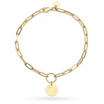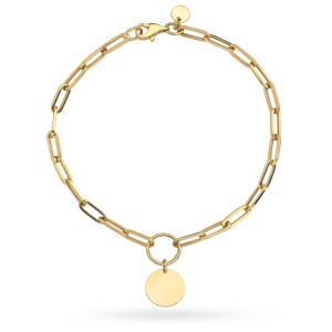 Stylowa i ponadczasowa bransoletka wykonana ze złota próby 585 zachwyca swoją prostotą i elegancją. Składa się z delikatnych, klasycznych ogniw, które tworzą lekką i elastyczną kompozycję. Centralnym punktem bransoletki jest zawieszka w kształcie pełnego, gładkiego kółka, która dodaje biżuterii nowoczesnego charakteru i subtelnej symboliki. To idealny dodatek dla kobiet ceniących minimalistyczny styl i wyrafinowane detale.