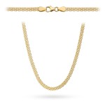 Solidny i elegancki łańcuch o klasycznym splocie Bismarck, wykonany ze złota wysokiej próby 585. Jego charakterystyczny, gęsty splot o szerokości 4 mm nadaje mu wyrazisty wygląd i sprawia, że jest trwały oraz odporny na codzienne użytkowanie. Długość 45 cm pozwala na komfortowe noszenie blisko szyi – zarówno samodzielnie, jak i z zawieszką. To ponadczasowy model, który idealnie sprawdzi się jako mocniejszy akcent w stylizacji – zarówno dla kobiet, jak i mężczyzn. Klasyka w nowoczesnym wydaniu.
