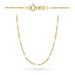 Złoty łańcuszek o splocie Singapure z blaszką to subtelna i elegancka biżuteria, która zachwyca swoją delikatnością i połyskiem. Wykonany z wysokiej jakości złota próby 585, łączy w sobie trwałość z klasycznym, kobiecym urokiem. Splot Singapure charakteryzuje się skręconym, lśniącym układem ogniw, które pięknie odbijają światło, nadając całości efektowny połysk i lekkość. Długość łańcuszka 50 cm sprawia, że doskonale układa się na szyi, pasując zarówno do codziennych stylizacji, jak i bardziej eleganckich zestawów. To idealny wybór na prezent – pełen klasy, symboliki i osobistego charakteru.