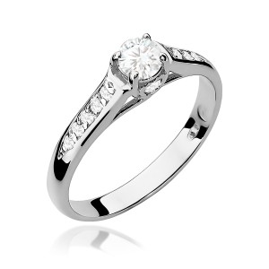 Szyna pierścionka również jest ozdobiona mniejszymi brylantami, które są symetrycznie rozmieszczone po obu stronach centralnego kamienia. Te boczne brylanty dodatkowo potęgują efekt świetlny, sprawiając, że pierścionek lśni z każdej strony.