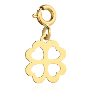 Zawieszka wykonana z żółtego złota o gładkim, lustrzanym wykończeniu, przedstawiająca motyw czterolistnej koniczyny. Delikatna, ażurowa forma z serduszkowymi wycięciami w każdym płatku nadaje biżuterii lekkości oraz subtelnego, romantycznego charakteru. Symetryczny kształt i precyzyjnie wykończone krawędzie pięknie odbijają światło, podkreślając elegancję wzoru. Motyw czterolistnej koniczyny symbolizuje szczęście i pomyślność, dzięki czemu zawieszka może pełnić rolę osobistego talizmanu. Model wyposażony jest w praktyczne zapięcie typu federing, umożliwiające łatwe przypięcie do bransoletki lub łańcuszka. To uniwersalny dodatek, idealny zarówno do codziennego noszenia, jak i jako drobny, symboliczny prezent.
