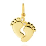 Zawieszka wykonana ze złota o próbie 585 to elegancki i subtelny dodatek, który przyciąga uwagę swoim unikalnym designem. Ma kształt stópek, co nadaje jej urokliwy i delikatny charakter. Każdy szczegół jest precyzyjnie wykonany, co podkreśla wysoką jakość rzemiosła. Na palcu jednej ze stópek umieszczona jest mała, błyszcząca cyrkonia w kolorze białym, która dodaje zawieszce subtelnego blasku. Cyrkonia jest starannie osadzona, aby zapewnić maksymalną trwałość i estetykę. Zawieszka w kształcie stópek z białą cyrkonią jest doskonałym wyborem na prezent, szczególnie dla osób ceniących sobie unikalne i osobiste akcesoria. Jej elegancki design sprawia, że jest idealnym dodatkiem do codziennej biżuterii lub na specjalne okazje np. narodziny dziecka, dodając odrobinę blasku i wyjątkowości każdemu stylizacji.