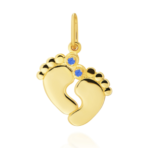 Zawieszka wykonana ze złota o próbie 585 przedstawia urokliwy motyw stópki, który jest zarówno elegancki, jak i symboliczny. Na dużym palcu stópki umieszczona jest błyszcząca, niebieska cyrkonia, która stanowi centralny punkt ozdoby. Cyrkonia jest starannie osadzona, co sprawia, że jej intensywny kolor wyróżnia się w kontrastowym połączeniu ze złotem. Całość jest pełna i gładka, co zapewnia estetyczny wygląd oraz wysoką jakość wykonania. Zawieszka jest doskonałym dodatkiem, który łączy elegancję z osobistym akcentem, idealna jako prezent lub jako wyjątkowa ozdoba dla siebie.
