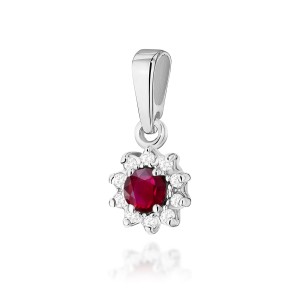Zawieszka w kształcie kwiatka, wykonana z białego złota w próbie 0,585. W centrum zawieszki umieszczony jest Rubin - kwintesencja klasyki i elegancji, symbol miłości i pasji. Dookoła zawieszki umieszczone są Brylanty które dodają mu blasku i podkreślają jego piękno. Zawieszka jest subtelna ale zarazem efektowna.