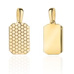 Nowoczesna zawieszka wykonana ze złota próby 585 o prostokątnej formie z delikatnie ściętymi narożnikami. To biżuteria łącząca minimalistyczną elegancję z wyrazistym, geometrycznym detalem. Jedna strona zawieszki została ozdobiona motywem plastra miodu, wykonanym z precyzyjnym diamentowaniem, które tworzy efektowną grę światła i nadaje zawieszce nowoczesnego charakteru. Druga strona jest gładka i polerowana, idealna do personalizacji poprzez grawer – imienia, daty lub ważnego symbolu. Solidna krawatka umożliwia wygodne noszenie zawieszki na łańcuszku. Dwustronna forma pozwala swobodnie zmieniać styl – od dekoracyjnego po klasycznie minimalistyczny. Zawieszka doskonale sprawdzi się jako stylowy dodatek do codziennych i eleganckich stylizacji, a także jako oryginalny i ponadczasowy prezent dla osób ceniących nowoczesny design i wysoką jakość wykonania.