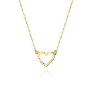 Naszyjnik wykonany z wysokiej próby złota 585 to elegancka i subtelna biżuteria, która z pewnością zachwyci swoją prostotą i ponadczasowym designem. Składa się z łańcuszka o splocie ankier, który jest delikatny, a jednocześnie solidny, co sprawia, że naszyjnik jest wygodny do noszenia na co dzień, a także w bardziej eleganckich okazjach. Zawieszka w kształcie serduszka dodaje biżuterii romantycznego charakteru. Na powierzchni serduszka znajdują się trzy precyzyjnie osadzone brylanty, które subtelnie odbijają światło, nadając naszyjnikowi wyjątkowego blasku. Te małe, ale efektowne diamenty podkreślają urok serca, czyniąc naszyjnik wyjątkowym wyborem na prezent lub osobisty upominek. Taki naszyjnik łączy w sobie prostotę z elegancją, będąc idealnym akcentem do każdej stylizacji, który dodaje szyku i subtelnego blasku.